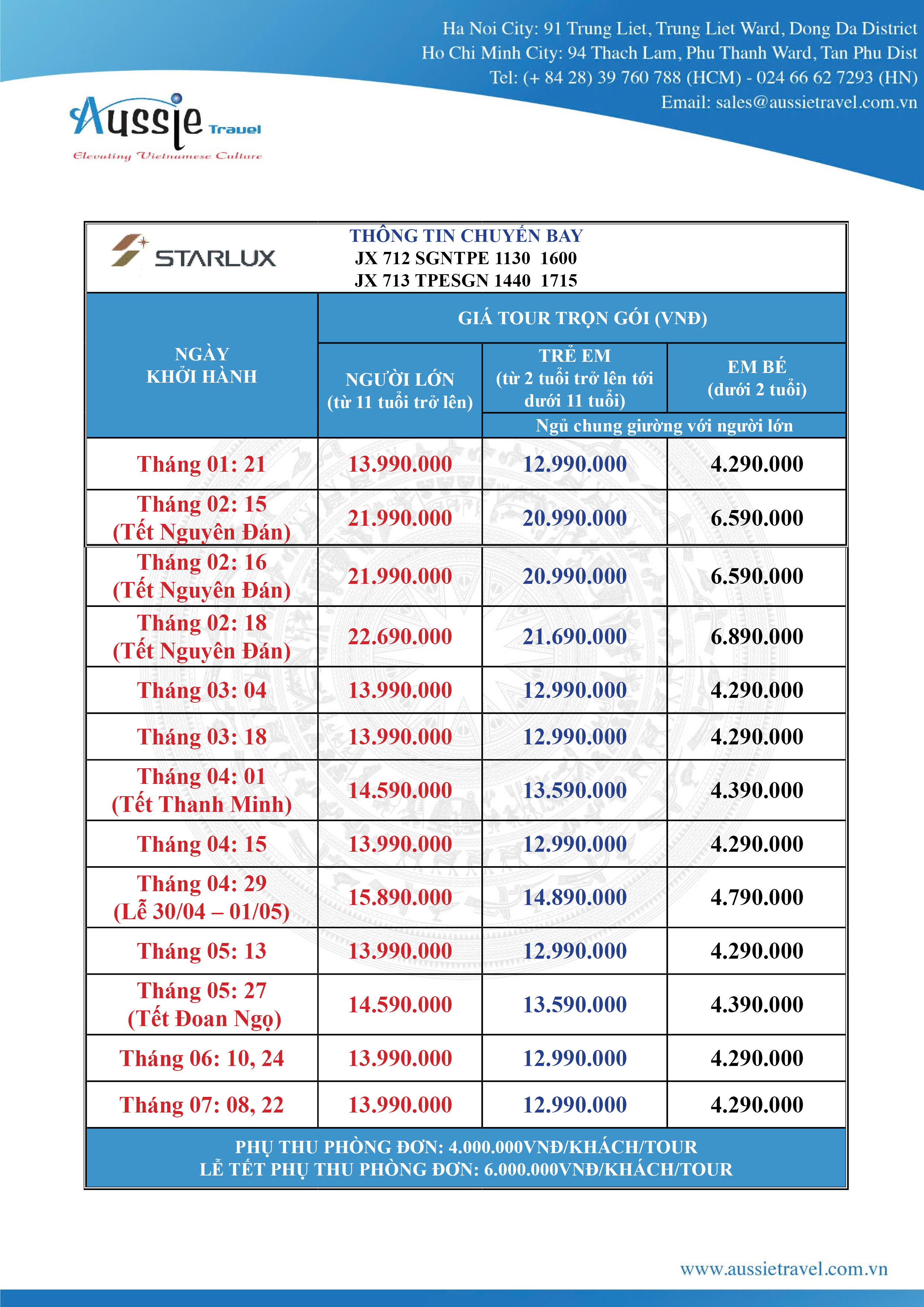 - Chiều: Đoàn về đến sân bay Tân Sơn Nhất đoàn làm thủ tục nhập cảnh Việt Nam và nhận lại hành lý cá nhân. Kết thúc chương trình, Aussie xin gửi lời cảm ơn vì sự tin tưởng đồng hành của Quý khách và chia tay, hẹn gặp lại Quý khách trên những hành trình về sau!