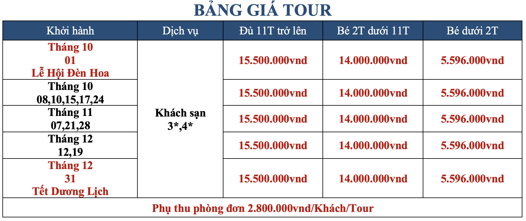 • Đủ 11 tuổi trở lên: 100% giá tour, tiêu chuẩn phục vụ là người lớn.