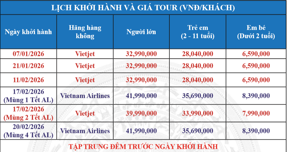 Lưu ý: Thứ tự các điểm tham quan có thể đổi tùy thuộc vào điều kiện thời tiết và tình hình giao thông. Tuy nhiên vẫn đảm bảo đầy đủ như chương trình đã đưa ra.