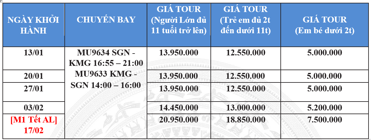 13:55: Quý khách tập trung tại Cột 12, Cổng D2 – Ga đi Quốc tế, Tầng 2, Sân bay Tân Sơn Nhất, gặp Trưởng đoàn làm thủ tục khởi hành chuyến bay MU9634 (16:55 – 21:00) đi Côn Minh – thủ phủ của tỉnh Vân Nam, Trung Quốc, được mệnh danh là “Thành phố mùa xuân vĩnh cửu”. (Ăn tối trên máy bay)