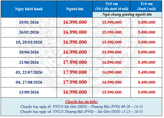 Khởi hành: Tháng 01, 02, 03, 04, 06, 07, 08, 09/2026