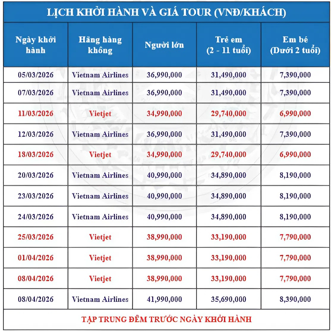 *Các đoàn khởi hành từ 23/03 đến 08/04, tham quan:
