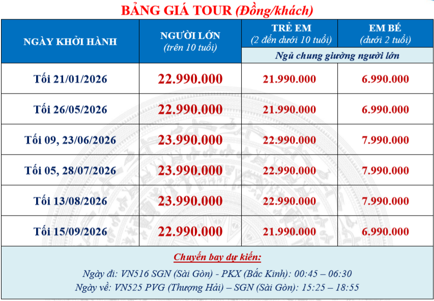 Khởi hành: Tháng 01, 05, 06, 07, 08, 09/2026